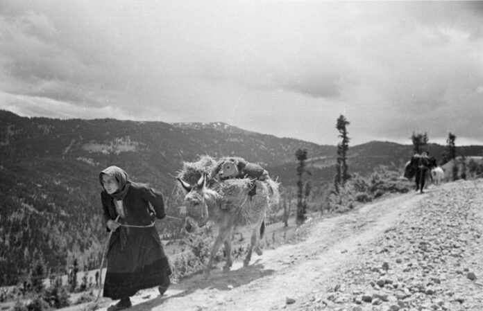 Egy idős görög asszony indul útnak a görög polgárháborús övezetéből 1948. május 22-én.