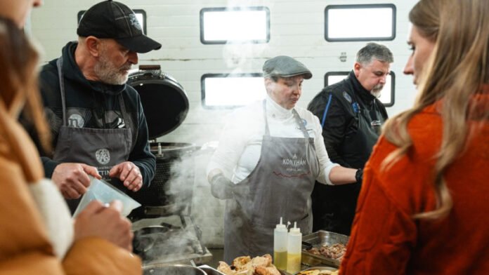 Undok, nyirkos időben érek a Balatonszentgyörgyi Sörművek udvarán osztozó lakatosműhelyhez. Előzetesen bejártuk a patikatisztaságú főzdét, ahol ügyesen elkerültem, hogy egy nagy pohár 11 százalékos, fahéjas-kávés barna sörrel – nagyon fahéjas, hasonló mértékben megosztó: a fő kérdés, hogy ki szereti, ha karácsonyi süti és dupla alkoholtartalom is van a sörében – nyissam az ebédet. Cserébe le is maradtam a csoporttól poháröblítés közben, úgyhogy a kijáratot elvétve visszafelé is végigjárom a főzdét, hogy kék lábzsákokban kicsoszogjak az udvarra. A tavat tavaszköszöntő programokkal körbepakoló Taste Balaton februári előkóstoló osztálykirándulásának résztvevői addigra már ellepték a kinti tócsákra való tekintettel a műhelyből leválasztott térben felállított sörpadokat.