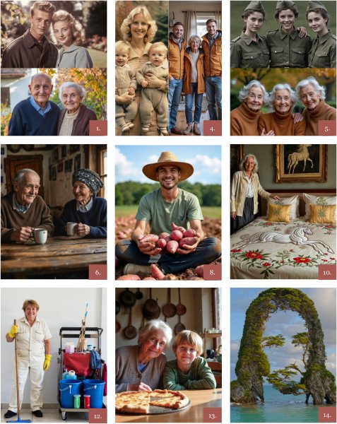 - Hibák a tömeg- és csoportjelenetekben: a háttérben látható emberek elmosódottak, torzak; az állatoknak anatómiai hibái vannak (pl. pluszlábak, hiányzó farok).